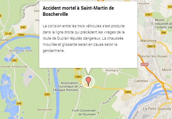 Trois véhicules, dont une Mégane et un Scénic Renault, sont entrés en collision sur le CD982, dans une ligne droite un peu avant les virages de Duclair entre Saint-Martin-de-Boscherville et Canteleu, près de Rouen. La Mégane venait de Rouen et le Scénic de Saint-Marin-de-Boscherville. Selon les premières constatations, la chaussée mouillée et glissante serait à l'origine du drame mais les circonstances exactes ne sont pas totalement établies par les gendarmes de la compagnie de Rouen.