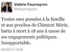 Pour sa part, Valérie Fourneyron, ministre des Sports, réagit sur son compte Twitter en ces termes : "Toutes mes pensées à la famille et aux proches de Clément Méric, battu à mort à 18 ans à cause de ses engagements politiques. Insupportable".