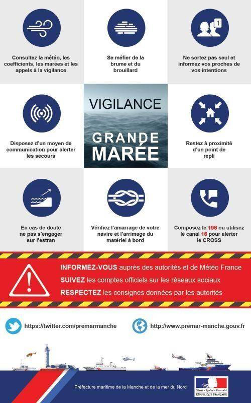 Ces forts coefficients de marée peuvent attirer de nombreuses personnes sur le littoral de la façade maritime de la Manche et de la mer du Nord. C'est pourquoi, le préfet maritime appelle à la plus grande prudence de tous les usagers de la mer, et en particulier ceux qui pratiqueront la pêche à pied ou qui se promèneront sur le littoral soumis à la marée. Quelques minutes peuvent parfois suffire pour être isolé par la marée montante.