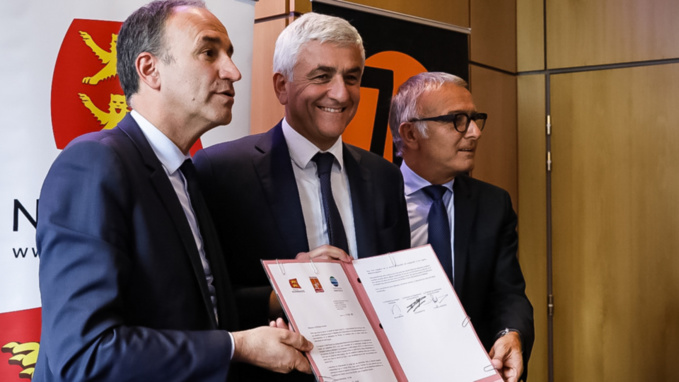 Frédéric Sanchez, Hervé Morin et Pascal Martin (de g.à d.) : "C'est un jour historique" (Crédit photo : J.Doinel/Région Normandie)