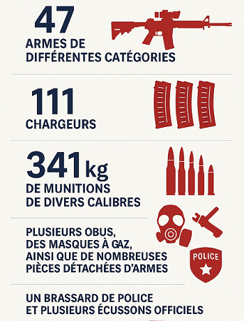 Lors de cette intervention, les douaniers mettent la main sur 47 armes de différentes catégories, dont certaines équipées de lunettes de visée, points rouges ou lampes, 111 chargeurs, 341 kg de munitions de divers calibres, plusieurs obus, des masques à gaz, ainsi que de nombreuses pièces détachées d’armes et un brassard de police et plusieurs écussons officiels.