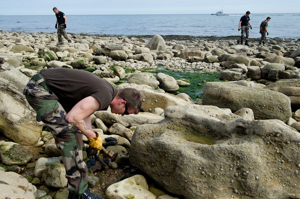 Les plongeurs démineurs ont été assistés dans leur tâche par le Groupement de reconnaissance et d'intervention en milieux périlleux (GRIMP) des sapeurs pompiers du Calvados, de la gendarmerie locale et de la vedette côtière de surveillance maritime (VCSM) Esteron de la gendarmerie maritime (périmètre en mer).