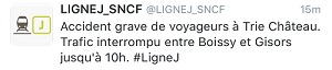 Le trafic des trains est interrompu jusqu'à 10 heures ce jeudi matin sur la ligne J Boissy et Gisors (Eure) en raison d'un "accident de personne" à Trie-Château (Oise) annonce la SNCF. Un bus va être mis en place (il est attendu à 9h30) pour assurer le transport des voyageurs bloqués à Trie-Château.