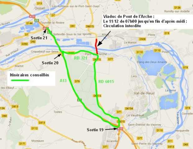 La préfecture de l’Eure et le Conseil général conseillent donc aux automobilistes dès à présent et jusqu’à la fin des opérations prévues mercredi en fin d’après-midi d’emprunter l’un des deux itinéraires suivants :