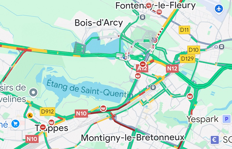 Pour les conducteurs circulant sur l’A12 et souhaitant rejoindre Trappes ou Rambouillet via la N10, il est recommandé d’emprunter la sortie Fontenay-le-Fleury et de suivre la direction “PL toute direction”, qui permet de contourner la zone impactée.