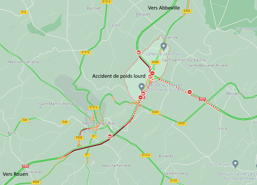 La circulation a été coupée dans le Rouen - Abbeville. Une déviation est mise en place par le RD928 entre les deux échangeurs.