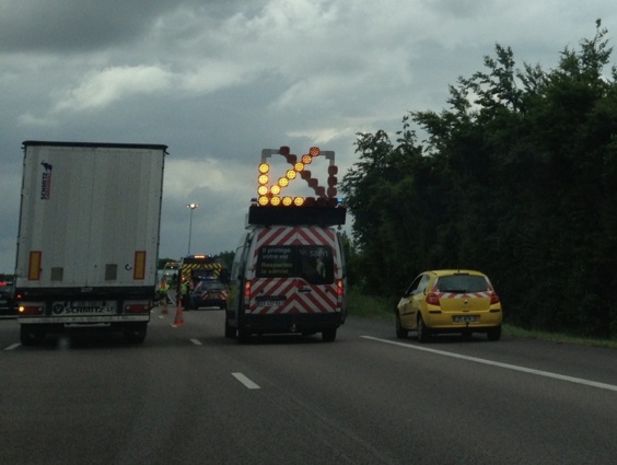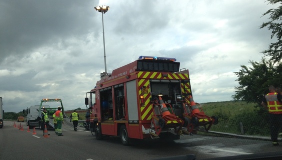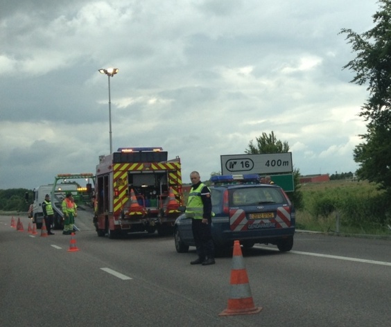 La voie de droite est neutralisée à cause d'une voiture sur le toit.