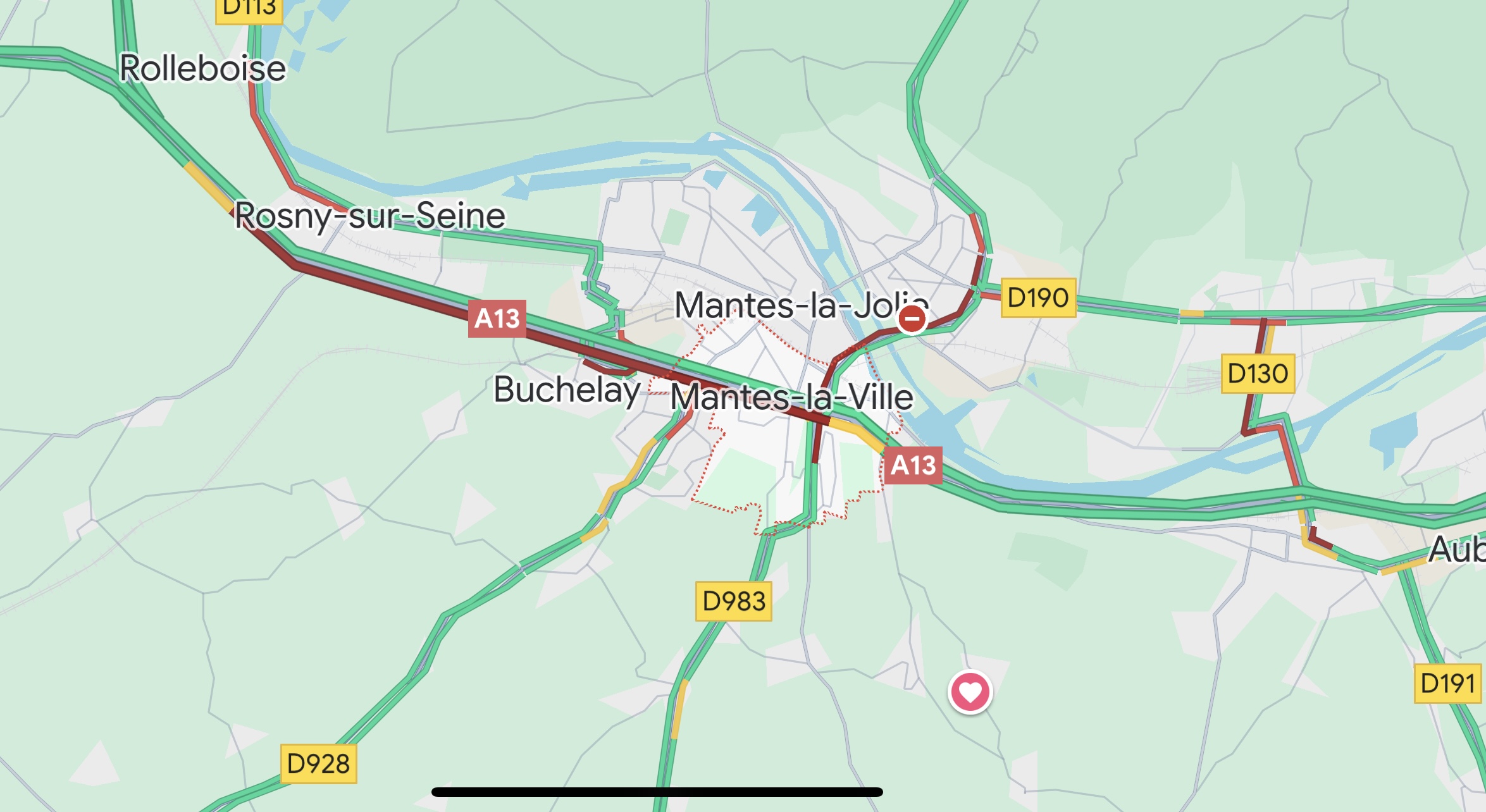 La collision, qui a impacté deux voies de circulation, entraîne un important bouchon de 8,5 km entre Rosny-sur-Seine et Mantes-la-Ville, s’étendant du PR 53+760 au PR 48+337.