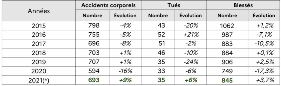 Selon le baromètre sécurité routière diffusé par la préfecture de Seine-Maritime, 693 accidents corporels et 845 blessés ont été comptabilisés entre le 1er janvier et 30 novembre 2021. 35 tués ont été déplorés : 15 en zone gendarmerie (contre 26 en 2019) et 20 en zone police (contre 7 en 2019).