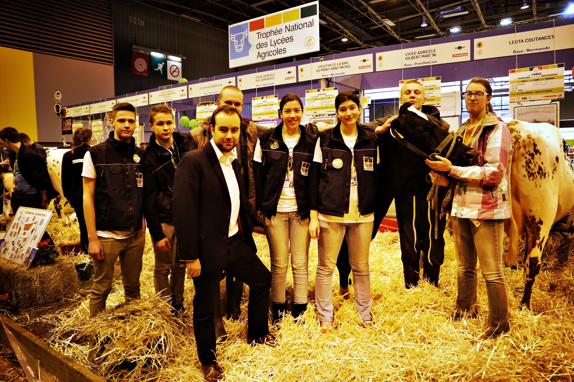 Le président de l'Eure, Sébastien Lecornu, avec les élèves du lycée agricole du Neubourg venus présenter la vache Génie (Photo@CD27)