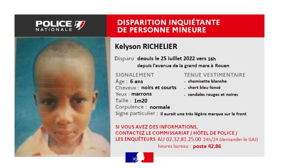 Suite à la disparition inquiétante de Kelyson Richelier, âgé de 6 ans, les services de police de Rouen lancent, ce mercredi soir, un appel à à témoin afin d’aider les enquêteurs à le retrouver.