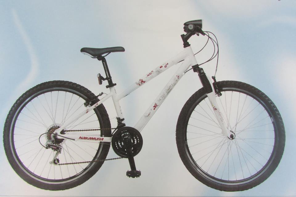 >Description du VTT : VTT intersport de couleur blanc avec des motifs rose.