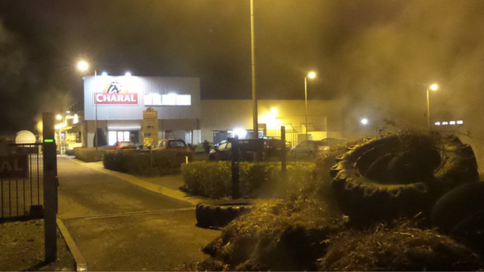 Après les agriculteurs du Bessin, ce lundi à Caen, c'est au tour de ceux du Pays d'Auge de passer à l'action. Cette nuit de lundi à mardi, autour de minuit, ils ont mené plusieurs actions spectaculaires à Lisieux (Calvados). Ils ont d'abord bloqué les accès au parking d'Intermarché, puis ceux de l'usine Lactalis Nestlé et de Charal, en déversant du fumier et des vieux pneus (Photo@Julien Bouteiller pour Aktua Prod).
