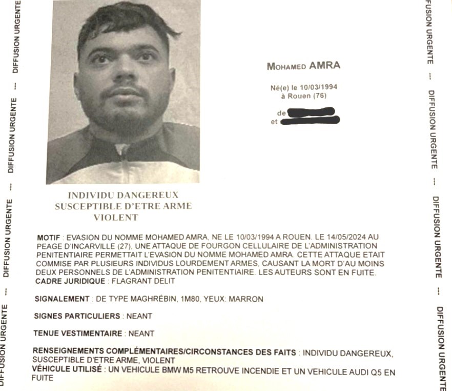 Une notice rouge a été émise à la demande des autorités françaises qui recherchent le prisonnier évadé Mohamed AMRA, alias « La Mouche ».