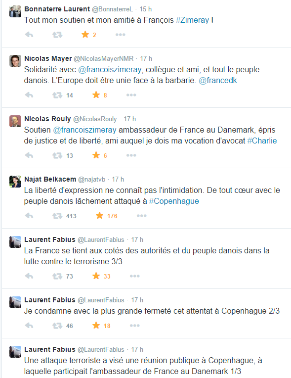 « J’adresse mes pensées émues et solidaires au peuple danois. Je souhaite également exprimer mon soutien à François Zimeray, épris de justice et de liberté, ami auquel je dois ma vocation d’avocat. Je salue son courage et son engagement constant au service des Droits de l'Homme. Il est essentiel que face au terrorisme et à la radicalisation, l’Europe reste unie. La défense de la liberté d’expression et de la démocratie doit tous nous mobiliser. Je réaffirme l’engagement du Département de Seine-Maritime en faveur de l’apprentissage et de la pratique du vivre-ensemble, de la laïcité et de la citoyenneté ».