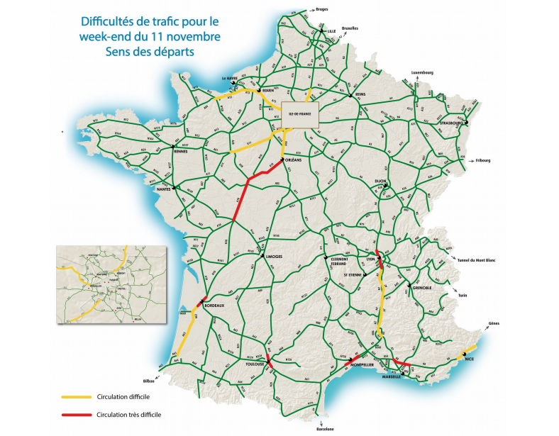 Vendredi 11 novembre, des départs sont encore attendus à partir de la capitale, départs qui s’accompagneront de ralentissements sur les rocades et les grands axes radians. En dehors de ces axes précis, la circulation sera généralement fluide.