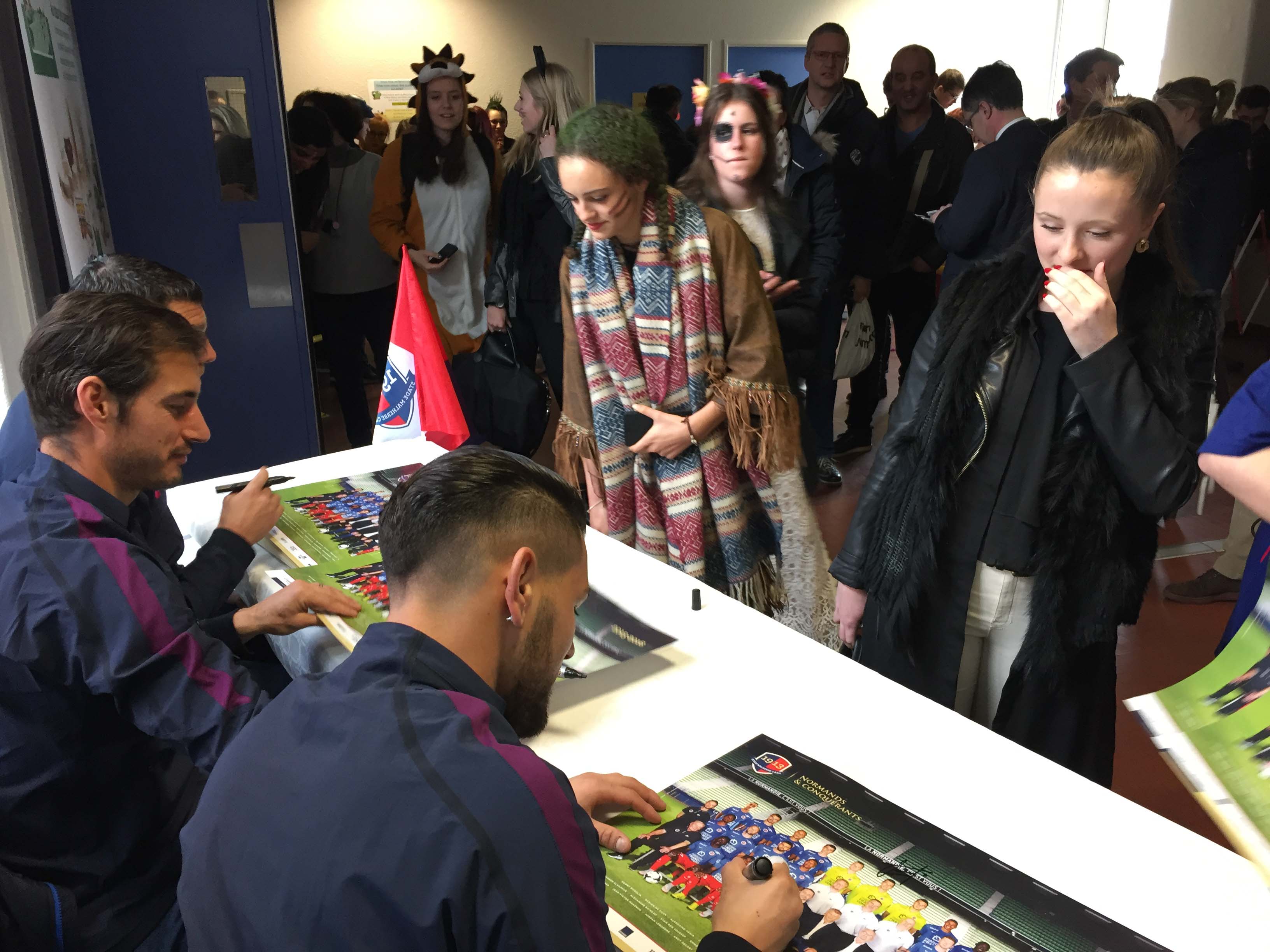 Les trois joueurs professionnels sont arrivés aux alentours de 12h45 pour une séance de dédicaces suivie d’une rencontre avec les élèves de l’Association Sportive. Ils ont ensuite partagé un « repas de sportif » préparé par Franck Pottier à partir de produits locaux (porc et volaille, pâtes, gratin de courgettes et crumble normand).