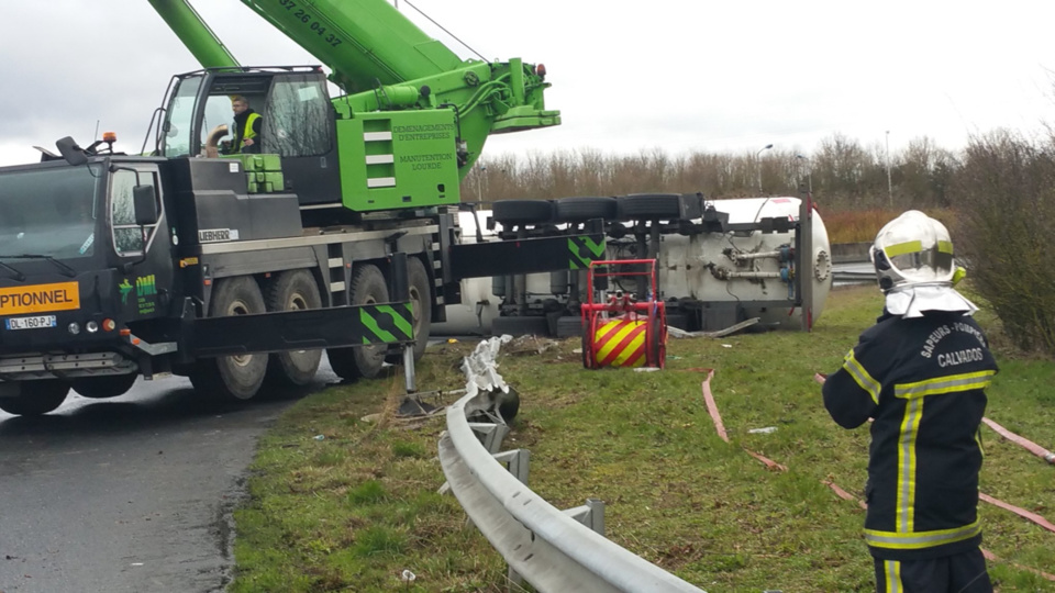 Dans le choc, le camion-citerne transportant du GPL (matière dangereuse) s'est en effet couché sur la bretelle Porte de Paris dans le secteur de Colombelles-Giberville.