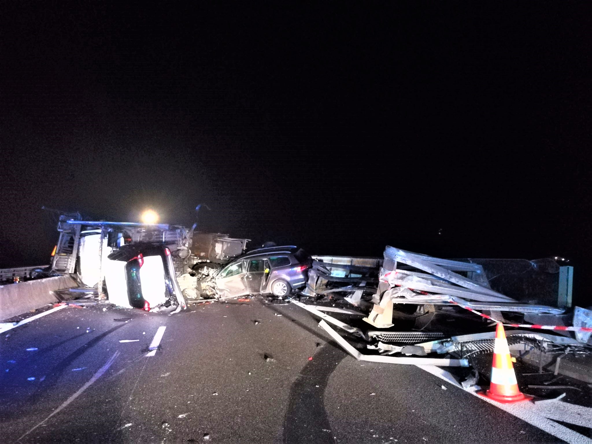 Deux voitures qui suivaient ont alors percuté le camion renversé. Les secours ont dénombré trois blessés qualifiés de légers, qui ont été transportés vers un hôpital pour examens.