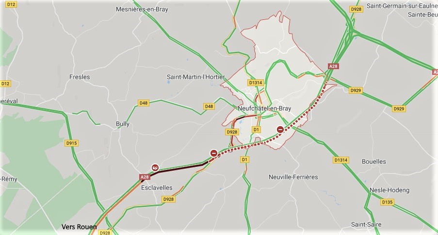 Pour l’heure, l’A28 est coupée en amont de Neufchâtel-en-Bray vers Abbeville et une déviation est mise en place par la RD 938, à partir de Quièvrecourt.