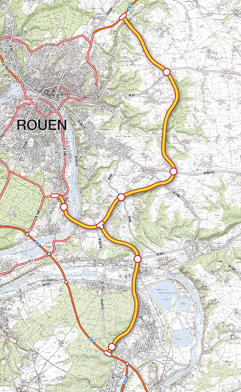 En plus des raccordements avec l’A28, l’A13/A154 et la RD18e, le projet prévoit 6 échangeurs avec les principaux axes rencontrés, la RN 31, la RD 6014, la RD 95, la RD 321, la RD 6015, et un échangeur à Oissel au coeur de la zone d’activités.