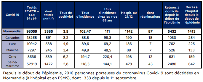 Les derniers chiffres publiés ce soir, ne sont pas particulièrement bons. Ils nous apprennent que le taux d'incidence en Normandie continue sa progression et passe de nouveau au-dessus des 100 cas pour 100 000 habitants pour atteindre 102,47 (contre 94,8 le 18/12). Le département de l'Orne atteint un taux record de 194,7.