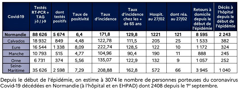 Au lundi 1er mars, 109 clusters (foyers de contamination) étaient en cours d'investigation en Normandie : 43 en Seine-Maritime, 27 dans le Calvados, 15 dans l'Eure et dans la Manche, 9 dans l'Orne.
