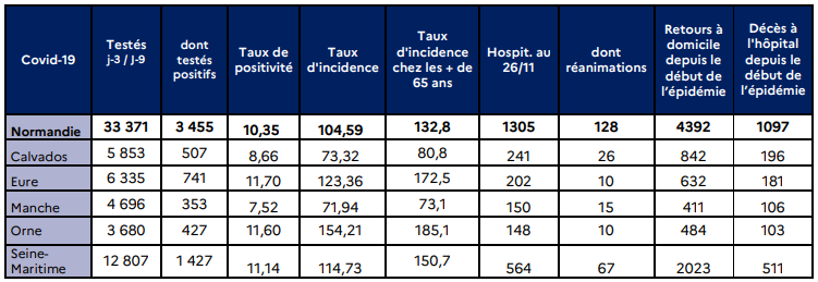 Dans le même temps, le ralentissement du nombre d'entrées en hospitalisation conventionnelle et en réanimation se poursuit. Néanmoins, insiste l'ARS, la pression sur le système de santé et sur les hôpitaux reste forte : 1305 personnes sont hospitalisées (contre 1369 le 23 novembre), dont 128 en réanimation (contre 148 à la même date). Des disparités départementales persistent.