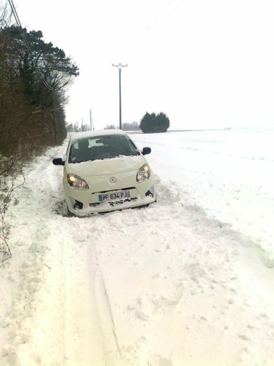 A Civières, un village du canton d'Ecos, Sylvie, auxiliaire de vie, a dû ce mardi matin abandonner sa voiture sur ce chemin enneigé et verglacé. C'est un agriculteur qui est venu la sortir de ce mauvais pas (Photo infonormandie.com)