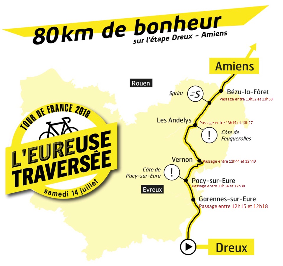 Entrée dans le département à Garenne-sur-Eure : vers 10 h 20 pour la caravane et vers 12 h 15 pour les coureurs.