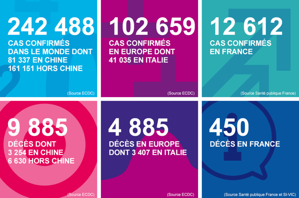 Les chiffres clés au 20/03/2020, arrêtés à 14h (mis en ligne en fin de journée sur le site santepubliquefrance.fr)