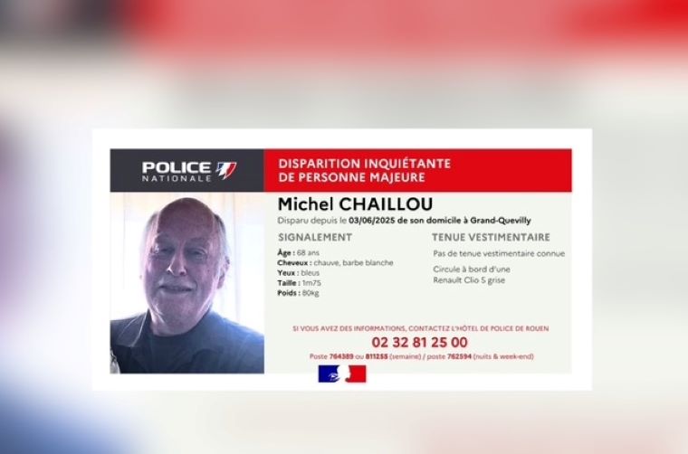 Toute personne susceptible d’avoir vu Michel Chaillou ou disposant d’informations permettant de le localiser est invitée à contacter l’hôtel de police de Rouen au 02 32 81 25 00.