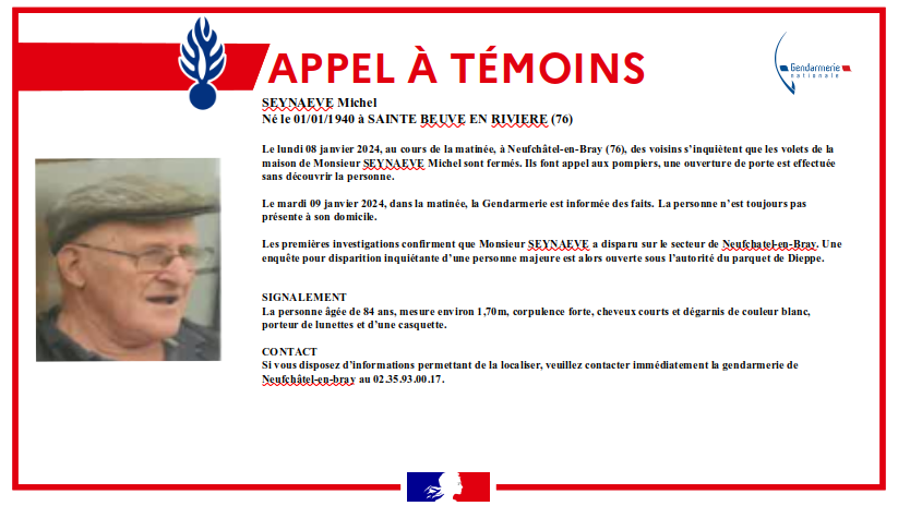 Une enquête a été ouverte par le parquet de Dieppe (Seine-Maritime) suite à la disparition inquiétante de Michel Seynaeve, âgé de 84 ans. Les investigations ont été confiées à la gendarmerie de Neufchâtel-en-Bray qui a, ce jeudi, lancé un appel à témoin..