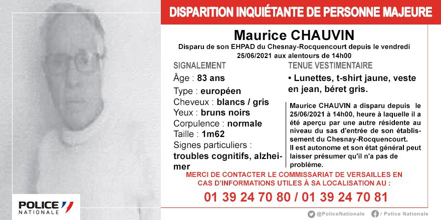 Marurice Chauvin a disparu de l'EPHAD (établissement d'hébergement pour personnes âgées dépendantes) du Chesnay-Rocquencourt le vendredi 25 juin, aux alentours de 14 heures. Il n'a pas, depuis, donné suite de vie.