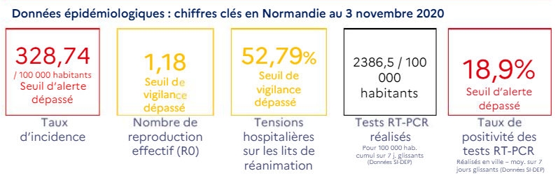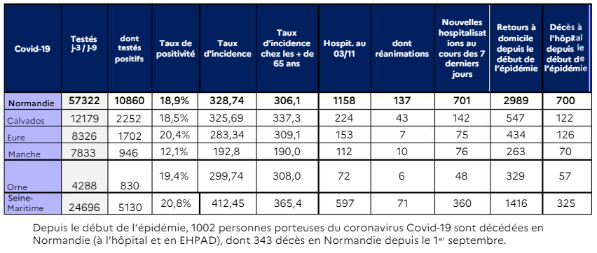 L'incidence continue d’augmenter en Normandie, très largement au-dessus du seuil d’alerte avec un taux régional de 328,74 pour 100 000 habitants au cours des 7 derniers jours (contre 311,82 le 30 octobre) : désormais 1 personne sur 5 qui se fait dépister est positive à la Covid-19.