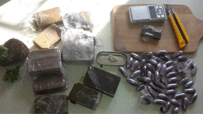 La perquisition de l'appartement permettait donc de retrouver 2 kg de résine de cannabis dont une partie conditionnée et prête à la revente. Trois grammes d'héroïne sont également retrouvés, ainsi que le matériel nécessaire au conditionnement de la drogue.