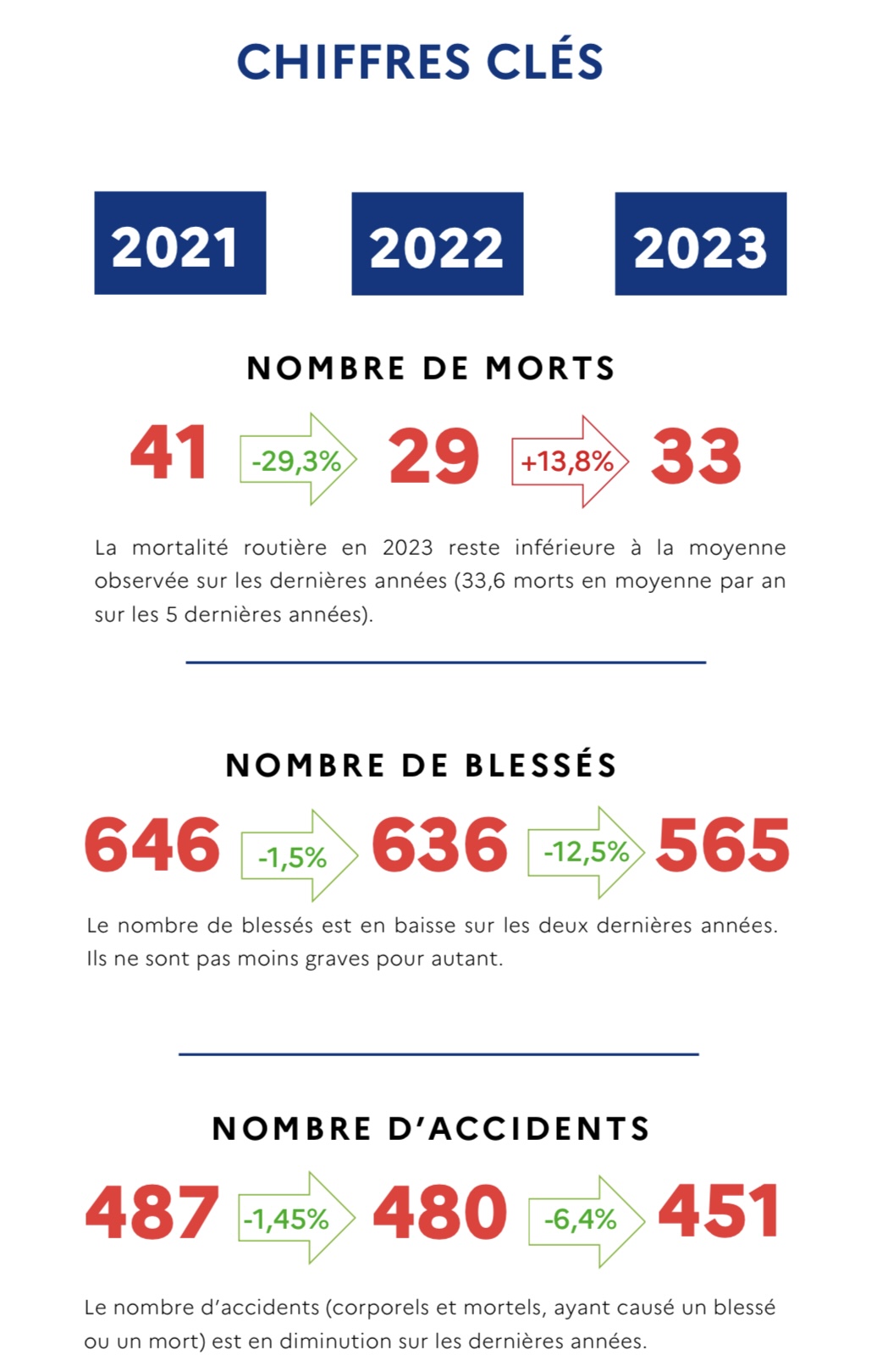 Le bilan de la sécurité routière fait état pour l’an dernier de 33 tués (en hausse de plus de 13% par rapport à 2022) et de 565 blessés pour 541 accidents.