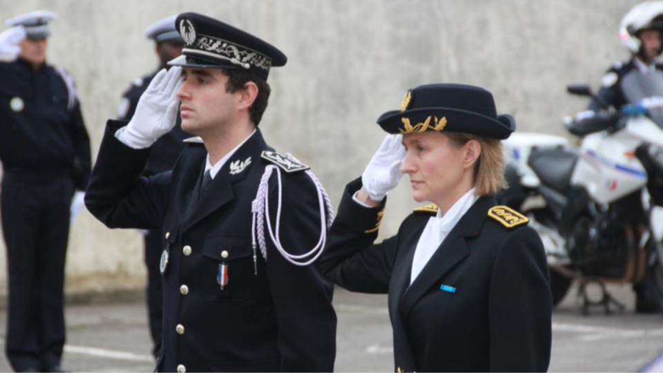 Le commissaire Antoine Dufourg ici en compagnie d'Aude Plumeau, directrice de cabinet du préfet, lors de la cérémonie d'installation dans la cour d'honneur du commissariat (Photo @DR)