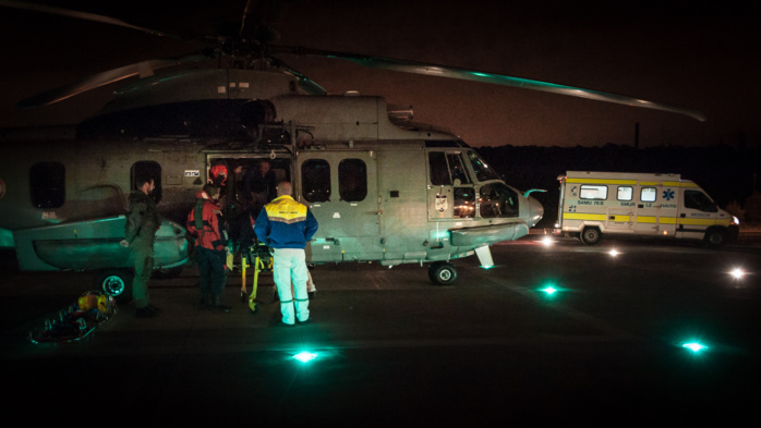 L'octogénaire a été pris en charge par l'hélicoptère de la Marine nationale pour être évacué au centre hospitalier du Havre où il est arrivé vers 2 heures ce matin (Photo Sébastien Richard)