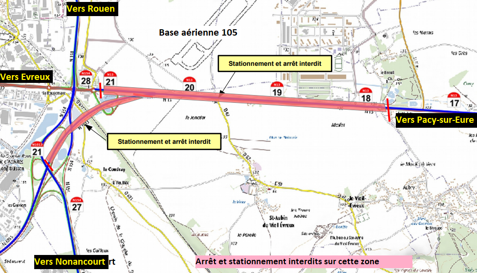 Pour cette raison, des mesures de sécurité vont être prises par la Direction interdépartementale des routes Nord-Ouest (Dirno) pour interdire ces deux jours-là l’arrêt et le stationnement sur la N13 et la N1013 dans les deux sens, ainsi qu’aux abords des bretelles de la Rougemare et du Coudray.