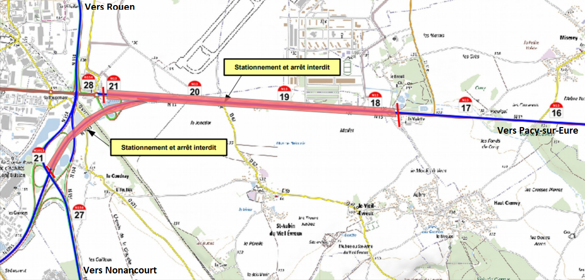 Des restrictions ont été prises pour interdire, à proximité des installations militaires, l'arrêt et le stationnement de tout véhicule sur la RN 13 et la RN1013 dans les deux sens ainsi qu’aux abords des bretelles de la Rougemare et du Coudray, les mercredi 13 et jeudi 14 juillet.