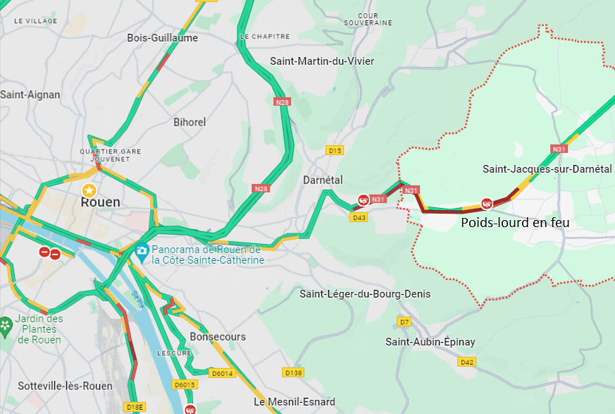 D'importantes perturbations sont constatées ce mercredi soir sur la N31 à hauteur de Saint-Jacques-sur-Darnétal (Seine-Maritime) en raison d'un feu de poids lourd. La route a été coupée dans les deux sens et une déviation locale a été mise en place pour une durée indéterminée, indique la Direction interdépartementale des routes Nord-Ouest (Dirno).