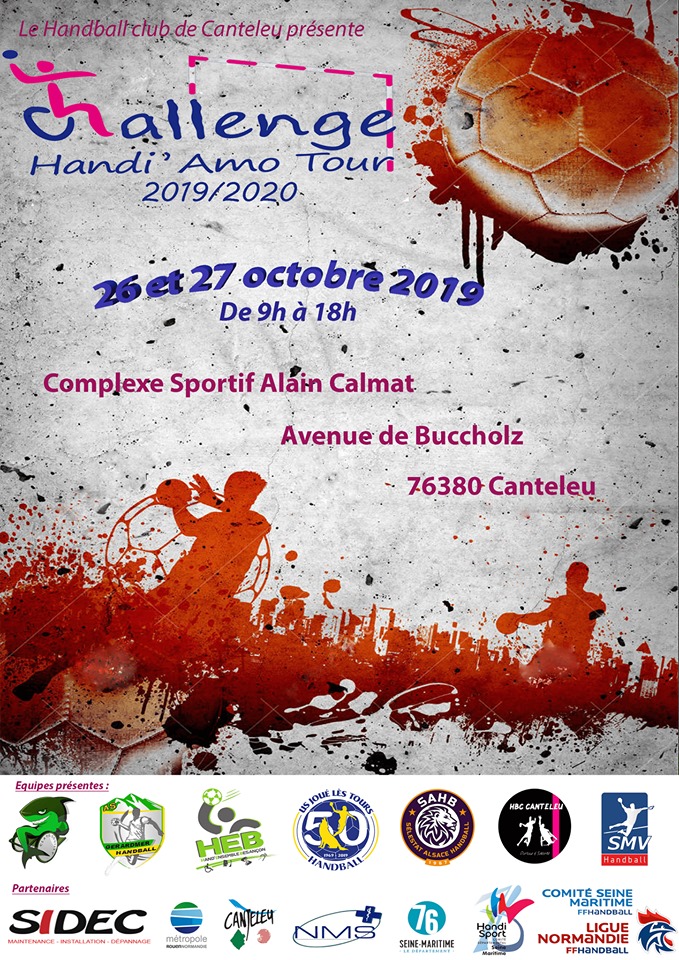 Dans le cadre du challenge « Handi'Amo Tour », le hand-ball club (HBC) de Canteleu (Seine-Maritime) organise, ce samedi 26 et dimanche 27 octobre, un tournoi national de hand'fauteuil, au complexe sportif Alain-Calmat à Canteleu, près de Rouen. Six équipes composées de joueurs valides et handicapés y participent : Sélestat, Besançon, Joué les Tours, Claye Souilly, Gérardmer et SMV Vernon.