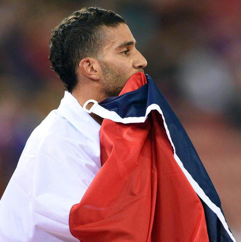 Hervé Morin, président de la Région Normandie, félicite Mahiedine Mekhissi pour sa médaille de bronze au 3 000 m steeple après la disqualification hier du Kényan Ezekiel Kemboï.