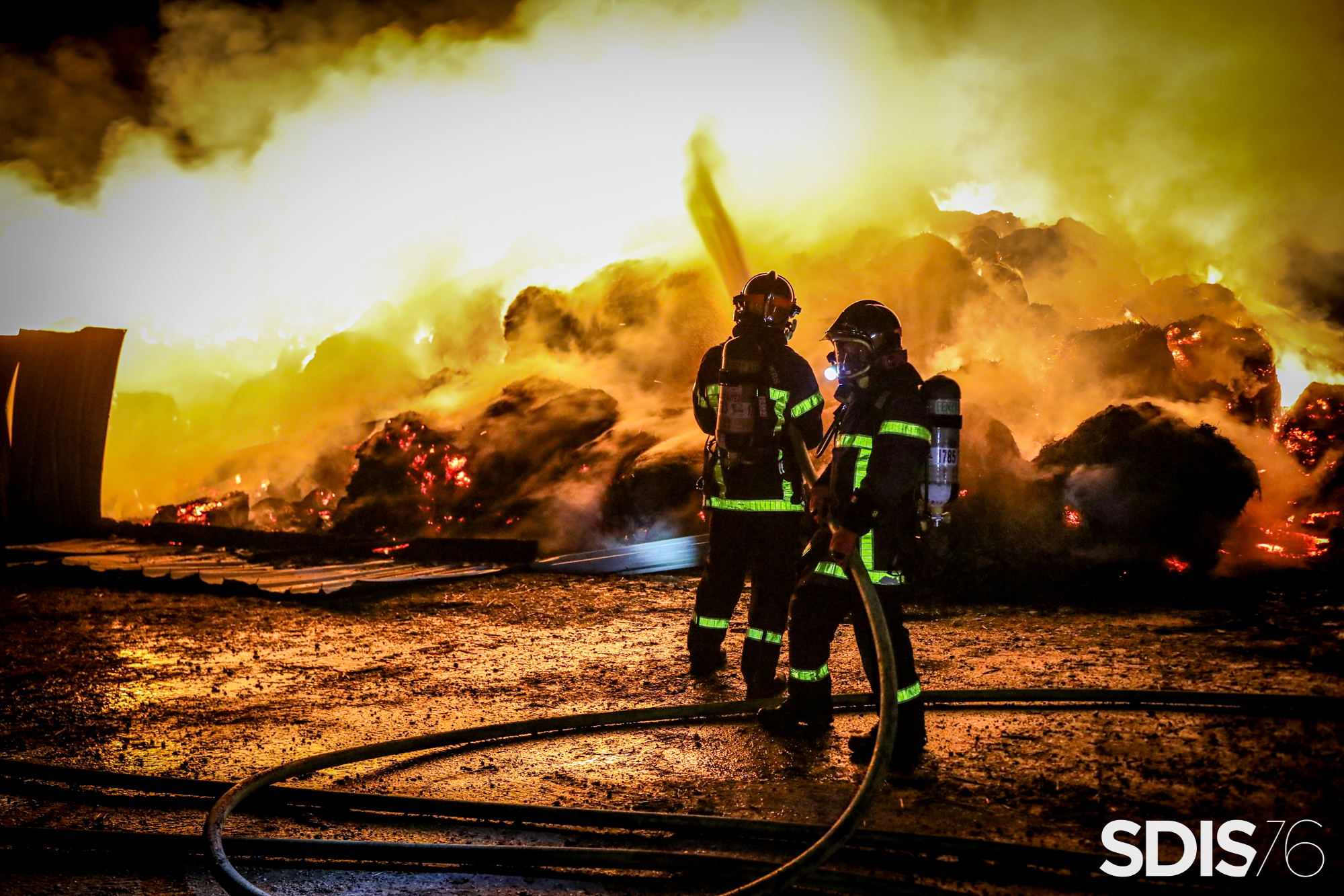 Le 25 février, à Tôtes, un bâtiment agricole de 800 m² a été dévasté par le feu. 600 balles de paille et de foin sont partis en fumée. été la proie des flammes. L’ampleur de l'incendiie avait nécessité la mobilisation de 44 sapeurs-pompiers et de 19 engins. Photo SDIS76