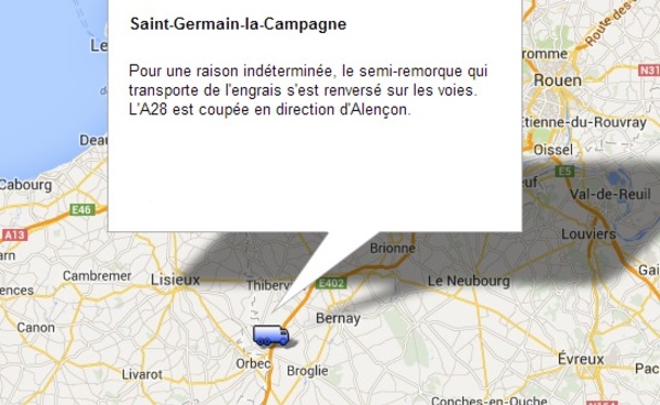 A la suite de l'accident d'un semi-remorque transportant des billes d'engrais, l'autoroute A28 est toujours coupé à la circulation dans le sens Rouen-Alençon, à hauteur de Saint-Germain-la-Campagne...