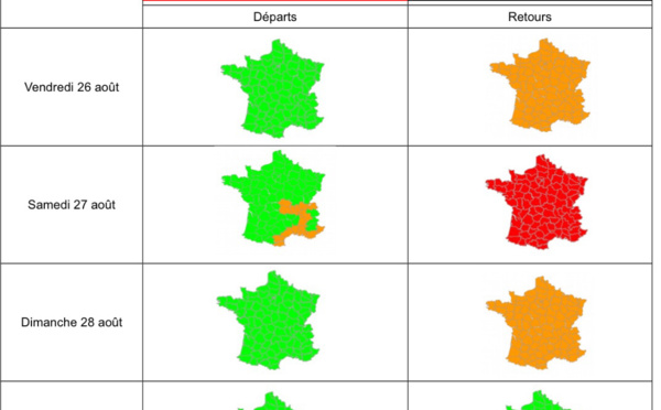 Ce samedi 27 août est classé rouge dans le sens des retours sur tout le territoire national. Il est classé orange dans le sens des départs en Rhône-Alpe-Auvergne et en arc méditerranéen. "Les...