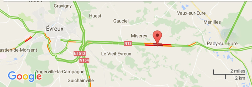 La RN 13 est coupée dans l'Eure à cause d'un accident, impliquant un véhicule léger et deux poids-lourds dont un camion-citerne, qui s'est produit ce mercredi midi à hauteur de Miserey (près d'Evreux) dans le sens Pacy-sur-Eure vers Evreux. Toutes les voies sont impactées, entre les kilomètres 15+660 et 16+162, indique Bison futé.