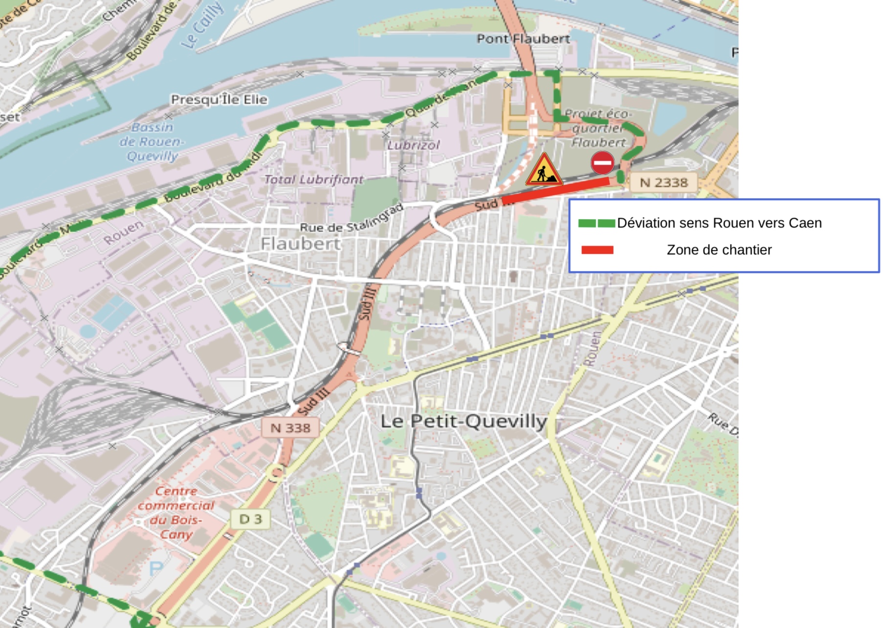 Une intervention de sécurité sur un atténuateur de choc situé sur la RN338 (Sud 3) est prévue par la direction interdépartementale des routes nord-ouest (DIRNO). Cette opération entraînera la fermeture de la RN338 dans le sens Rouen vers Caen, dans le secteur du giratoire de la Motte durant la nuit du lundi 10 au mardi 11 février de 20h30 à 06h00.