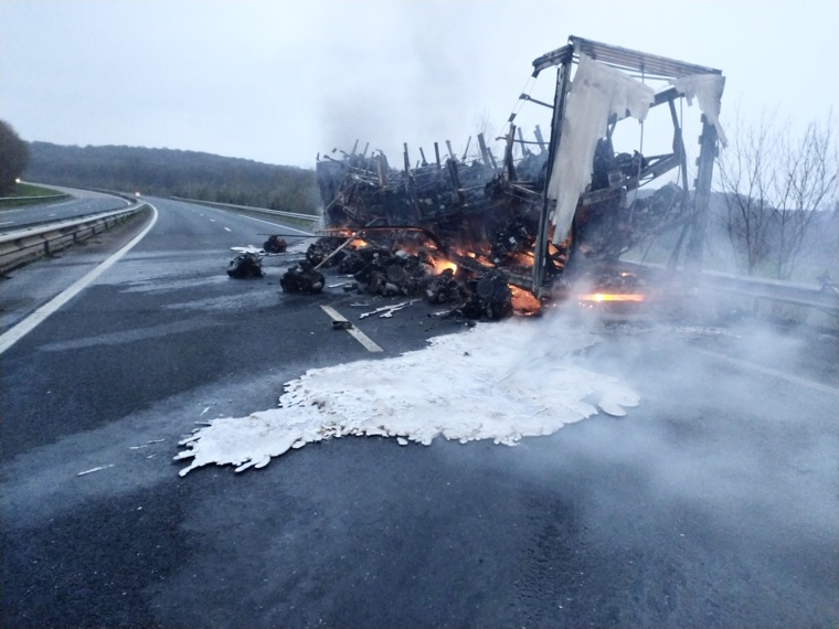 Le camion qui transportait des pièces métalliques a été entièrement détruits par les flammes, malgré l'intervention d'une quinzaine de sapeurs-pompiers avec cinq engins.